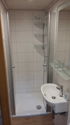 Klein aber fein. Das Bad ist mit Dusche und WC ausgestattet.