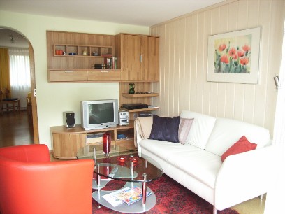Das Wohnzimmer ist ausgestattet mit einem Sat-TV und Radio.